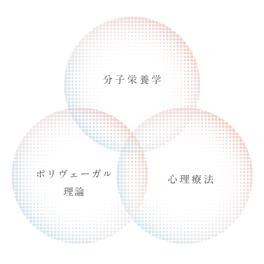 WELLのカウンセリングは、「分子栄養学 × ポリヴェーガル理論 × 心理療法」の3本柱で構成されています。